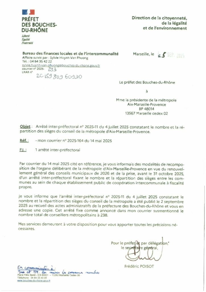Arrêté inter-préfectoral n°2025-11 du 04 juillet 2025 constatant le nombre et la répartition de sièges du conseil de la métropole d’Aix-en-Marseille-Provence