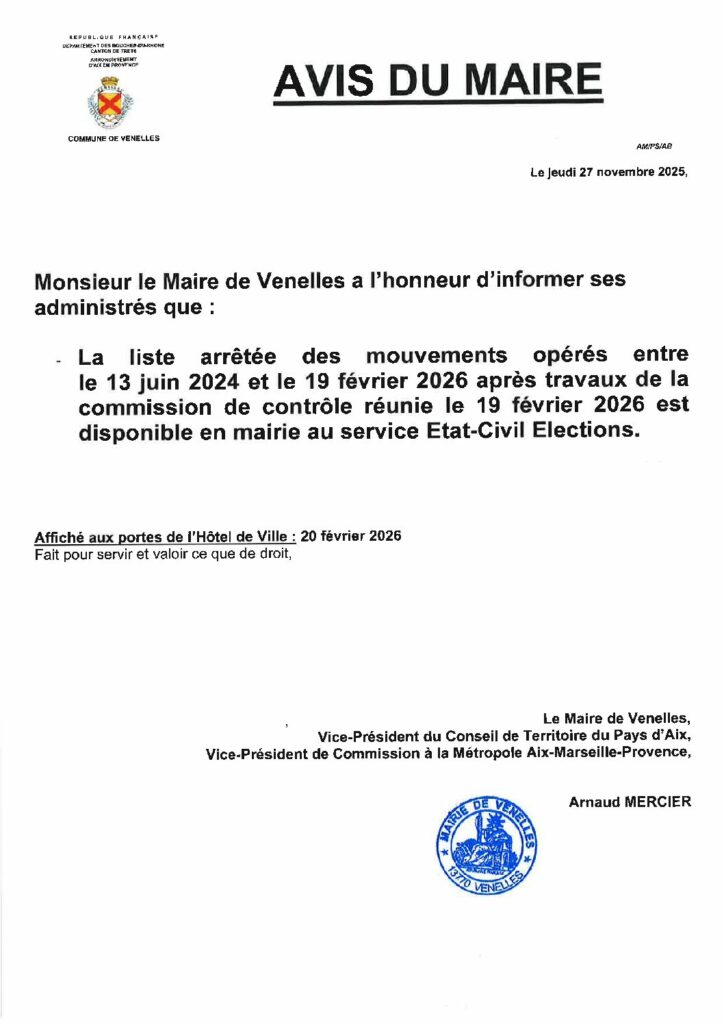 Liste arrêtée des mouvements opérés entre le 13 juin 2024 et le 19 février 2026 après travaux de la commission de contrôle réunie le 19 février 2026 est disponible en mairie au service Etat-Civil Election